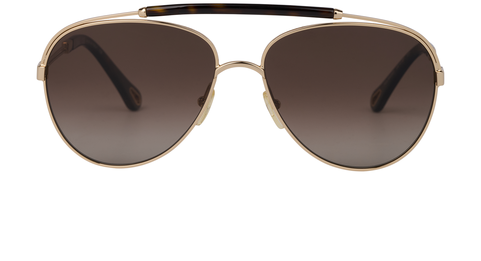 These are elegant Chloe Aviator-style sunglasses for women, featuring gold metal structure, with tortoise-shell temple tips and polarised brown gradient lenses for maximum protection.