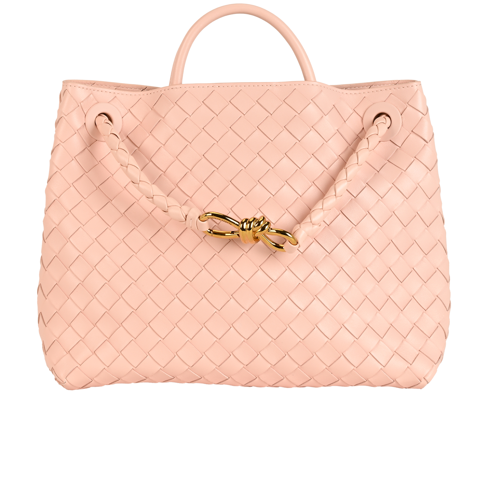 Top handle bag in supple Intrecciato leather with signature knot detail and sliding cross-body strap.This bag is eligible for Certificate of Craft. Intrecciato leather top handle bag with sliding cross-body strap. Compartmented interior with one zippered pocket, two open pockets. Magnetic closure. Lining: Lambskin bonded Intrecciato.