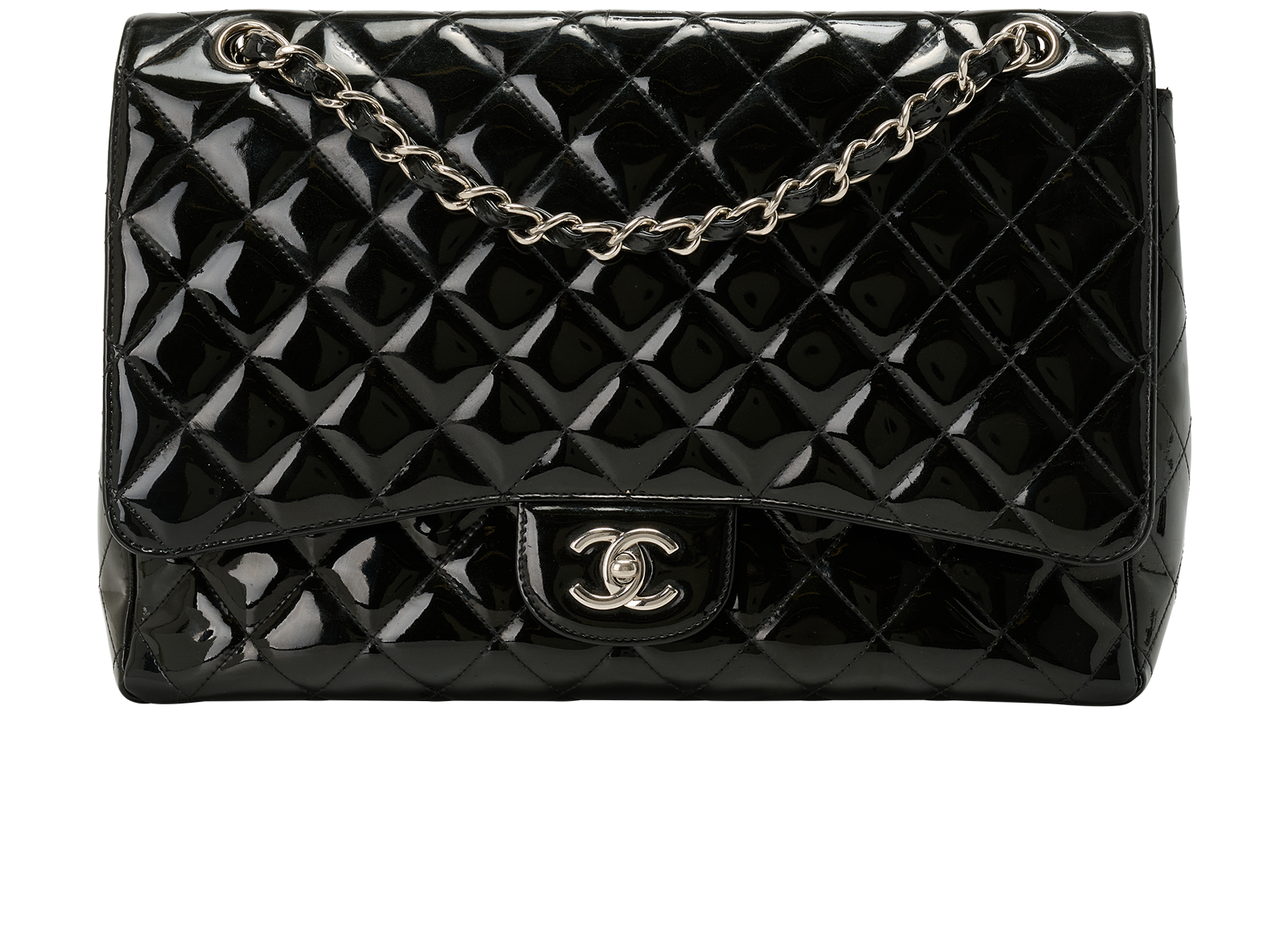 This item is in fair condition with visible signs of wear such as worn patent leather with stains and small white marks and scratches inside the bag.