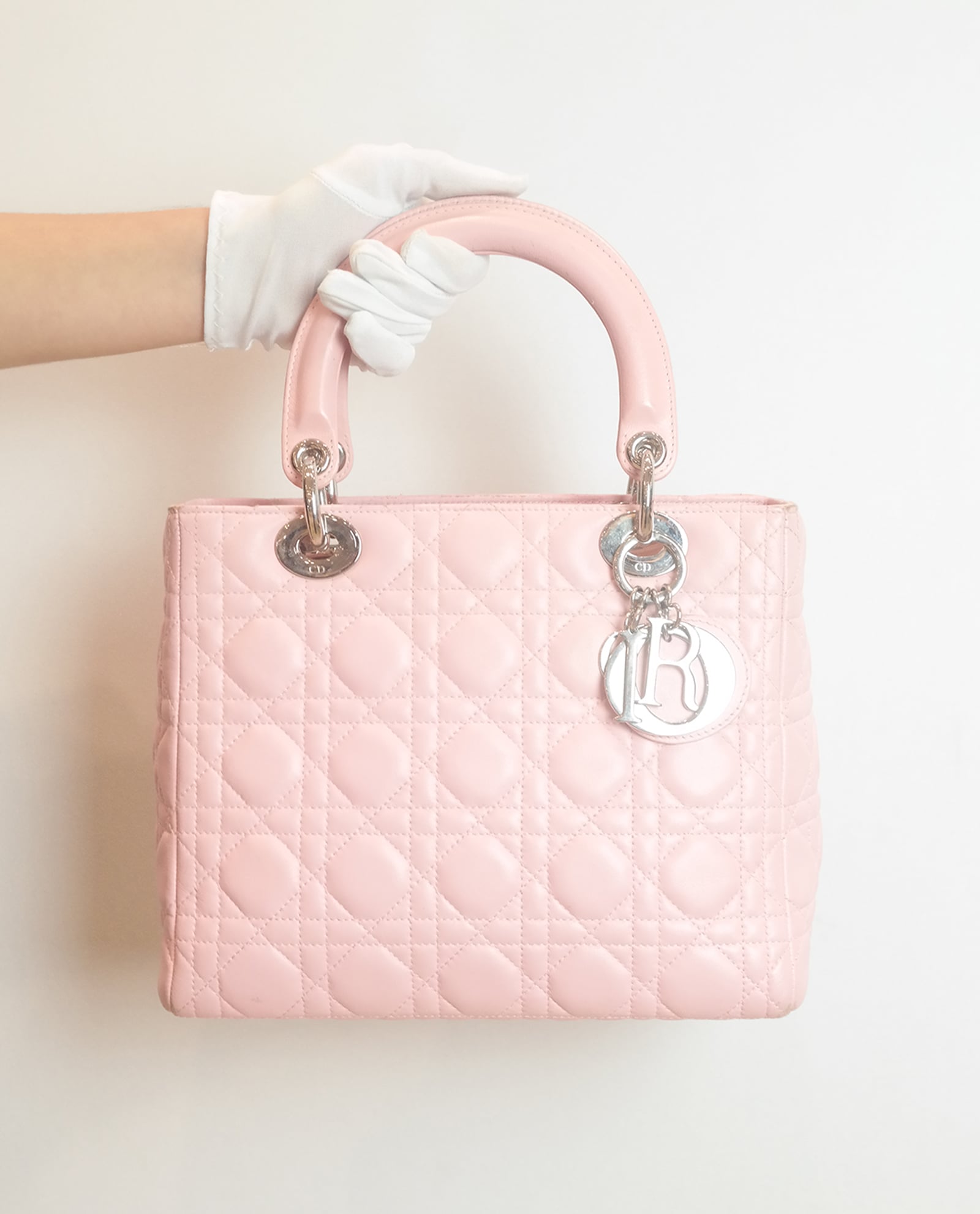 This 'Lady Dior' by Christian Dior is beautifully crafted from baby pink lambskin leather. This classic piece features the brands iconic 'Cannage' quilted design, two top structured leather handles and is finished with silver hardware and 'Dior' hanging charm. This elegant and stylish bag opens up to a red 'Dior' logo interior. This versatile bag can be hand held or worn on the shoulder or cross body as it comes with a detachable strap