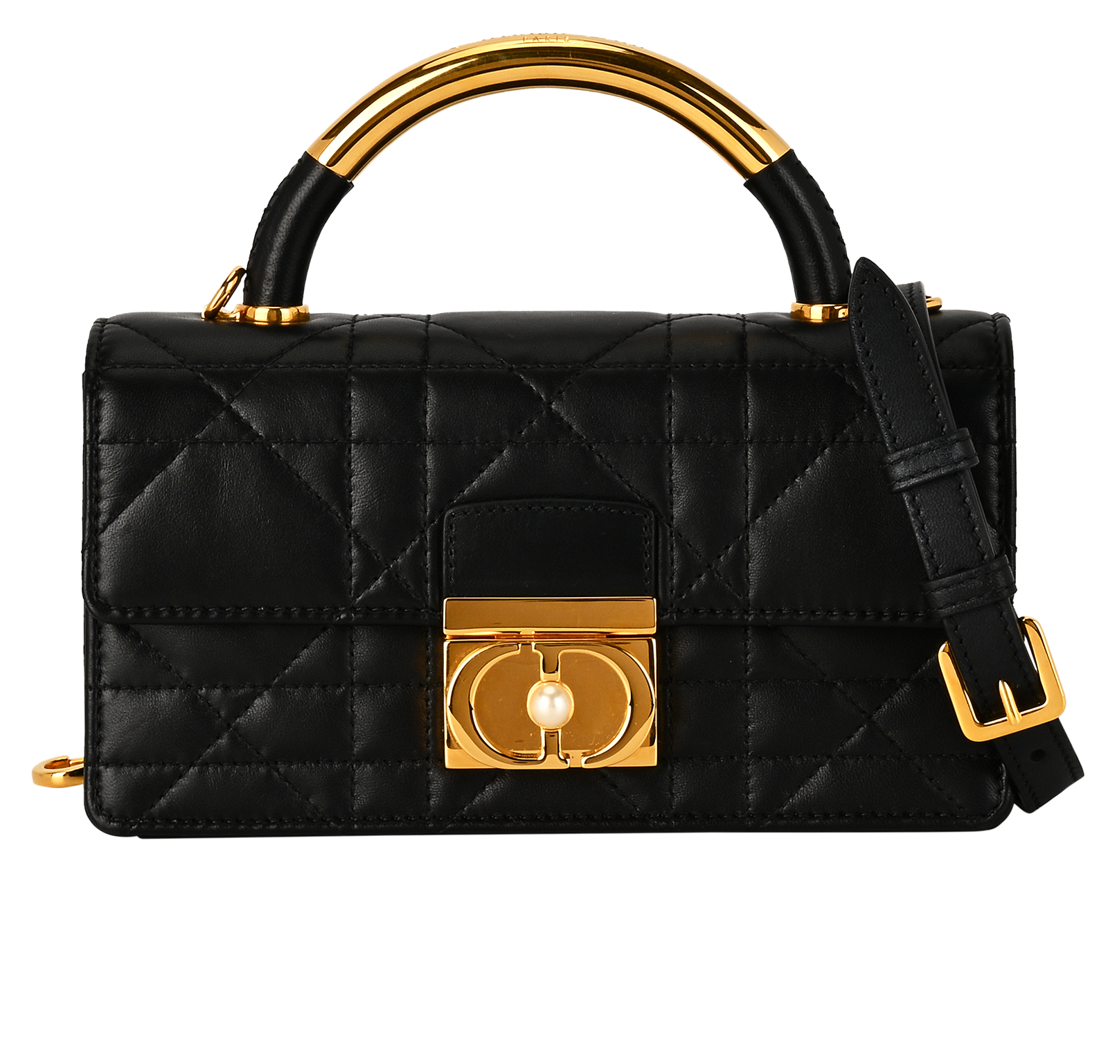 The Dior Jolie Top Handle bag presents an elegant and functional design. It is crafted in black calfskin with Cannage stitching and features a double flap enhanced by a CD signature embellished with a varnished aluminum pearl, as well as three compartments to accommodate all the essentials, day or evening. The removable top handle is completed by a detachable chain strap with a leather insert and CD signature links embellished with resin pearls, allowing the miniature bag to be comfortably carried by hand, worn over the shoulder or crossbody. Main composition: calfskin. Kidskin and calfskin lining. CD clasp with white varnished aluminum pearl on the front. Double flap closure. Three interior compartments Interior slip pocket. Leather top handle. Adjustable and removable chain shoulder strap with resin pearls and leather insert. Made in Italy.
