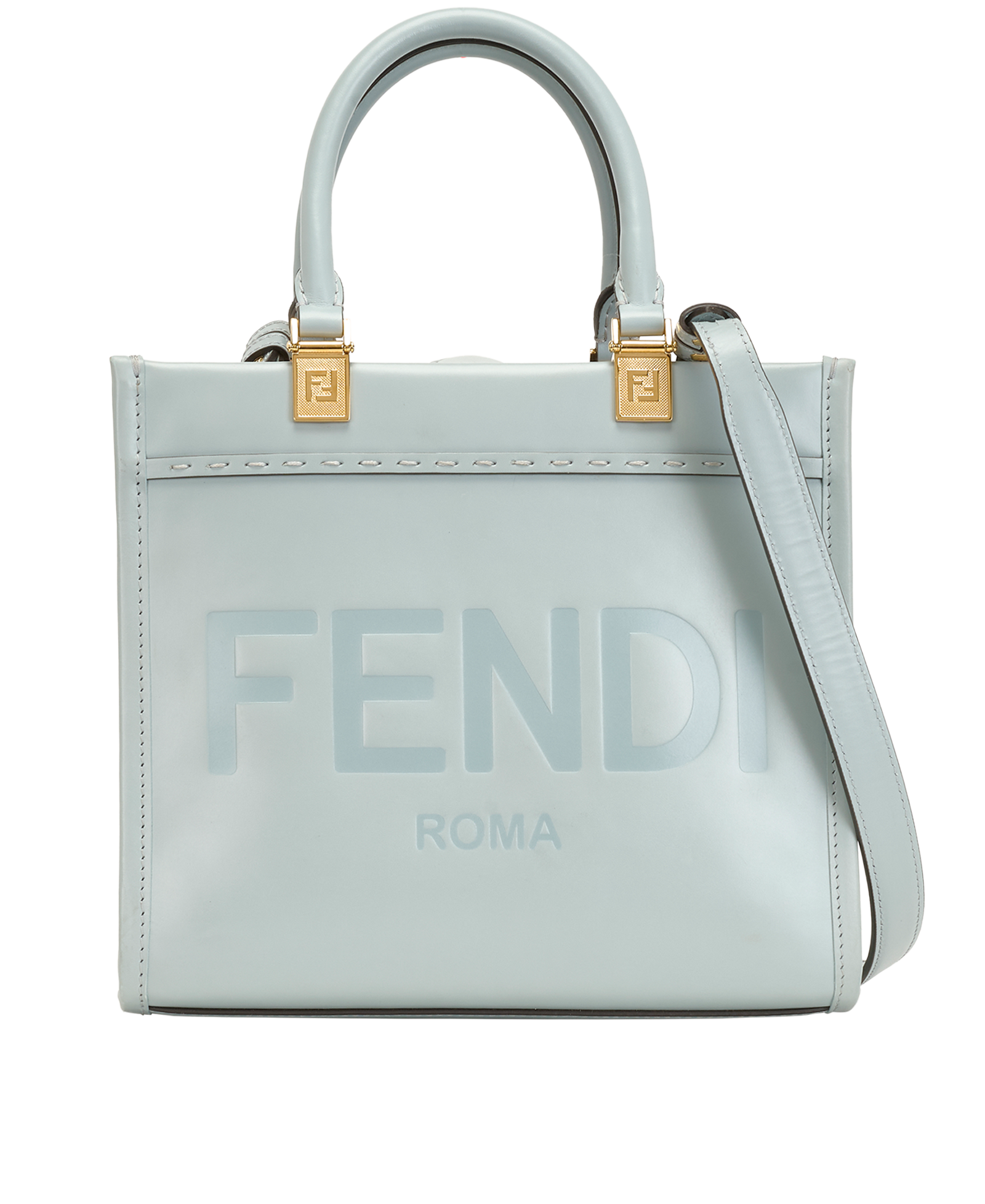Small Sunshine bag, a roomy, versatile city shopper that stands out thanks to its linear design and sophisticated details. Made from brown calfskin with hot-stamped “Fendi Roma” and stiff plexiglass handles with a tortoiseshell effect. Features a spacious lined internal compartment, edges in tone-on-tone leather, and gold-finish metalware.The bag can be carried by hand with the two handles, or worn either on the shoulder or cross-body with the adjustable, detachable shoulder strap. Made in Italy.