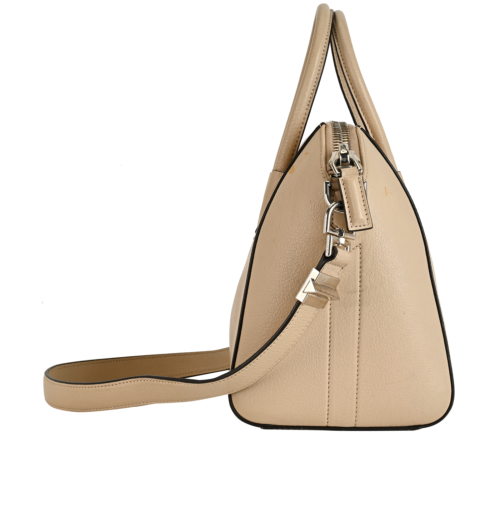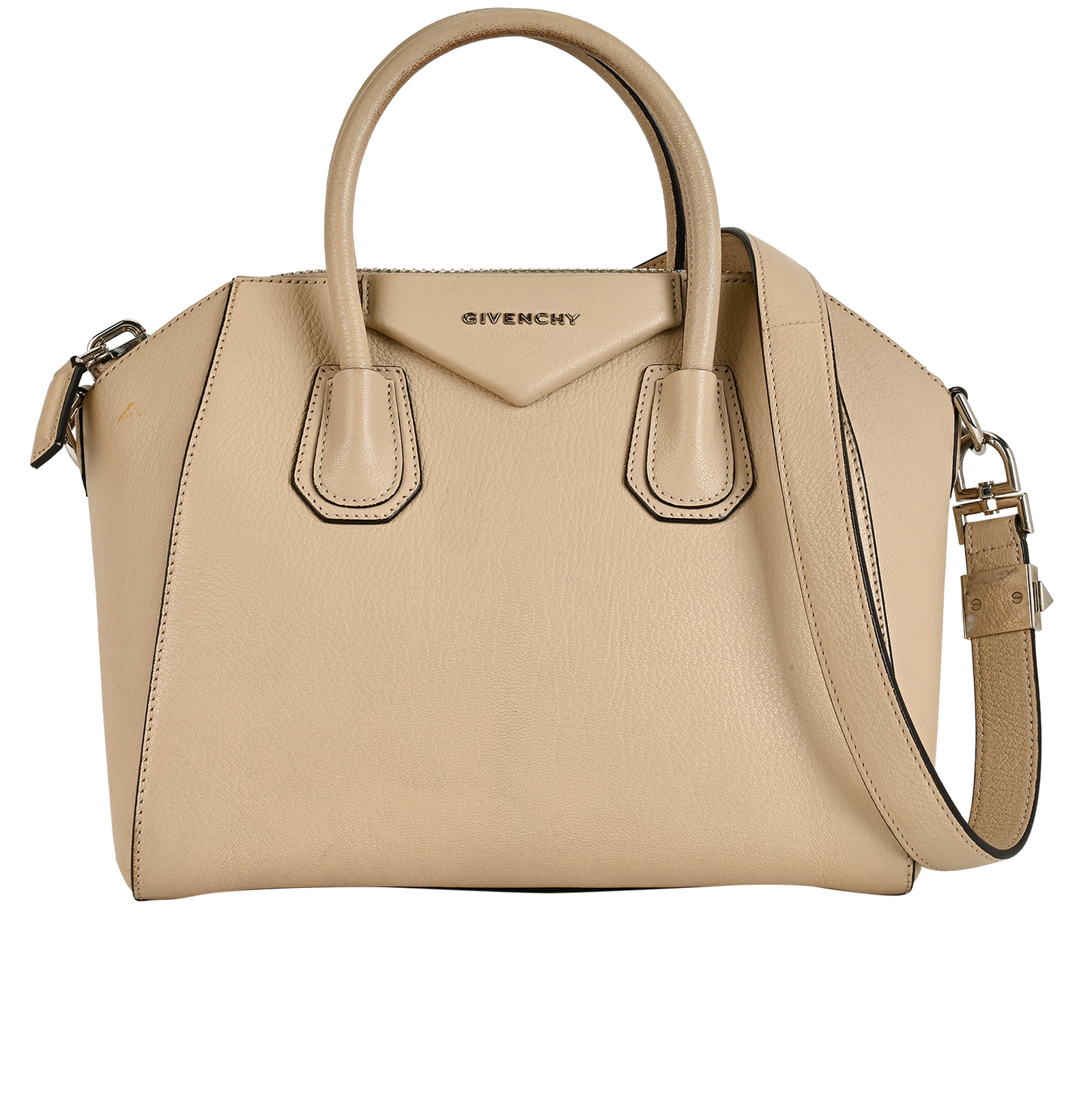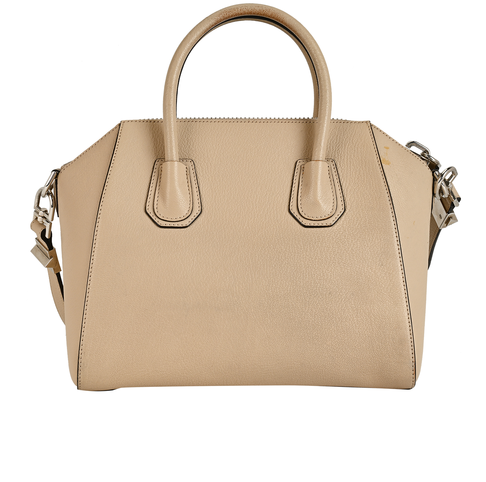 This item is in good overall condition with obvious signs of use on the corners with stains and small scratches on the base of the bag.