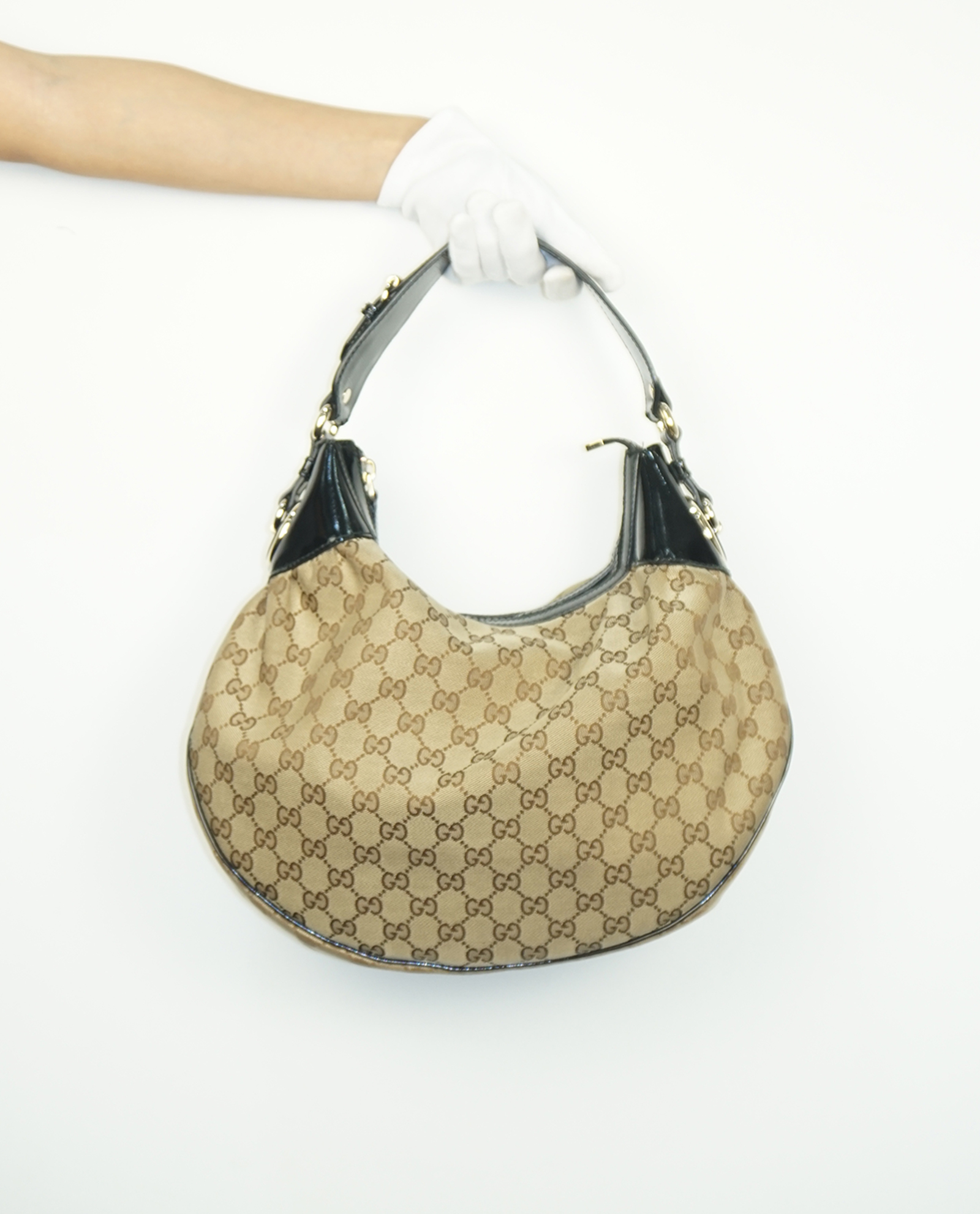 This 'Full Moon' Gucci hobo is crafted from canvas featuring the classic GG print. It has a thick, high-shine black leather shoulder handle and trim, and is finished with champagne gold hardware. This stylish piece is ideal for casual day use.