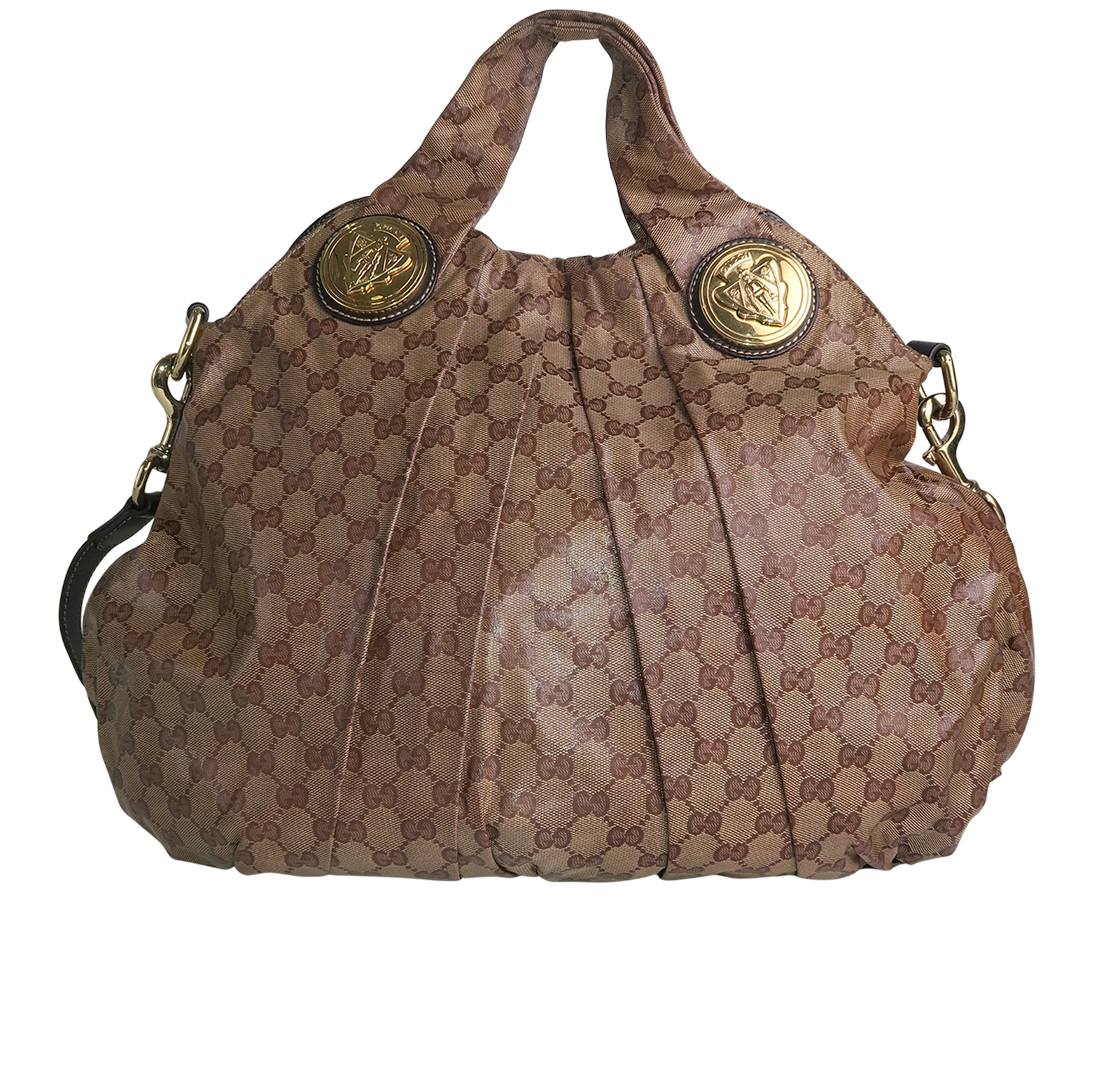 This Gucci tote bag is in good condition with signs of wear, such as wear marks on the handles and discoloration marks on the inside.