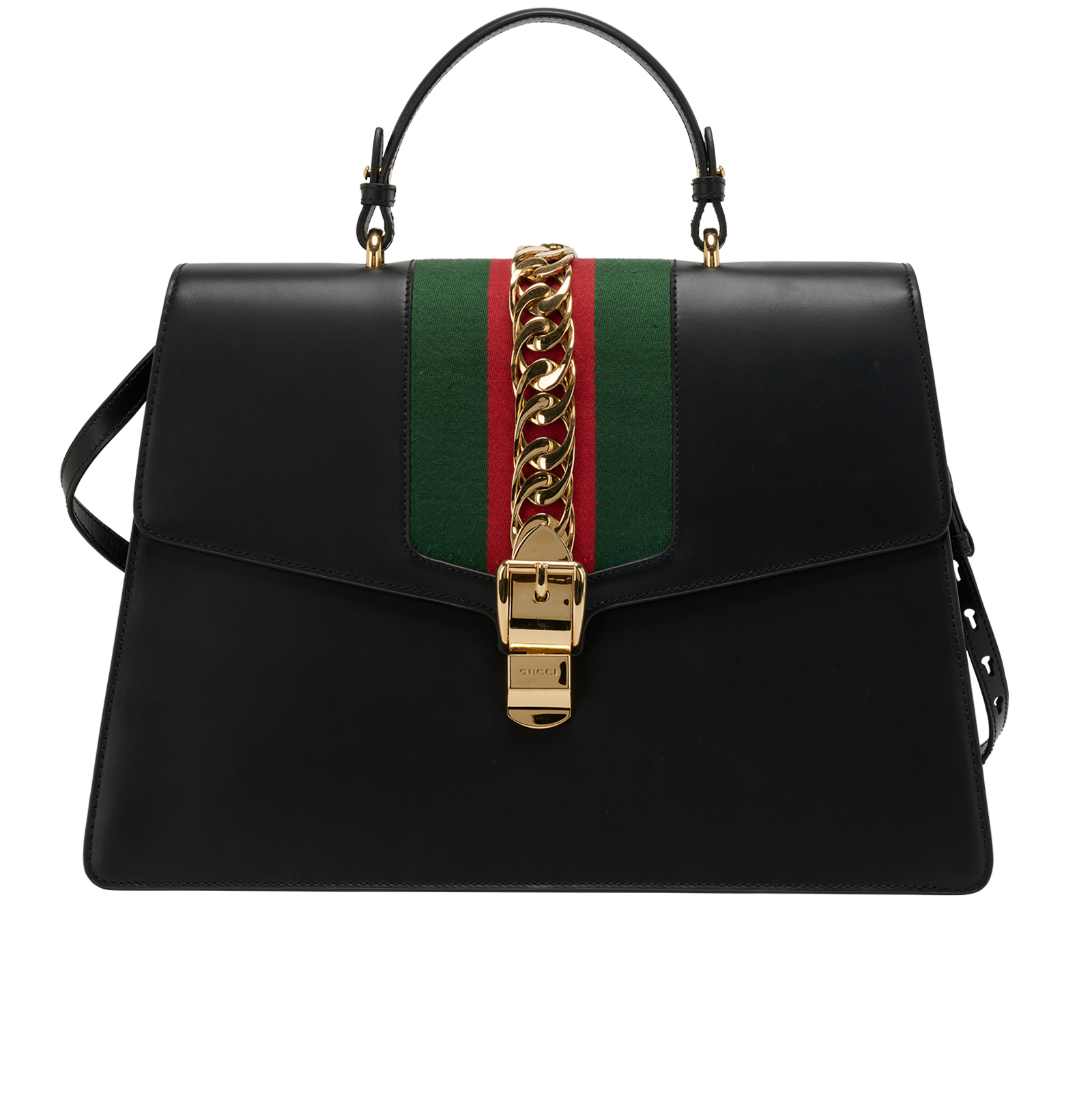 This gorgeous Maxi Sylvie gucci bag is crafted from smooth calfskin leather with large, structured top - handle, including detachable shoulder strap, and spacious, suede - lined interior.