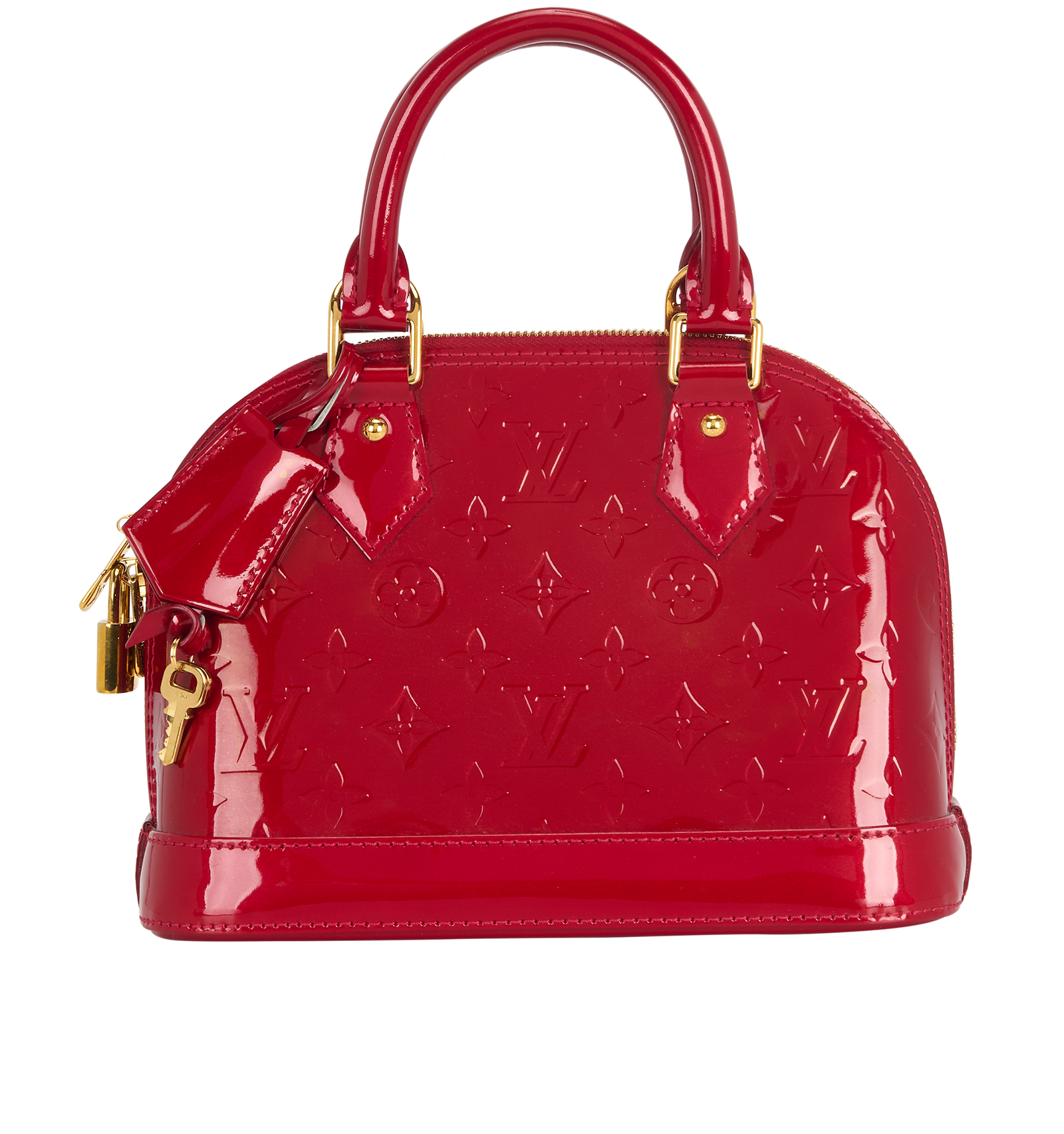 This item is in good overall condition with some obvious signs of use such as small scratches on the patent leather and hardware.