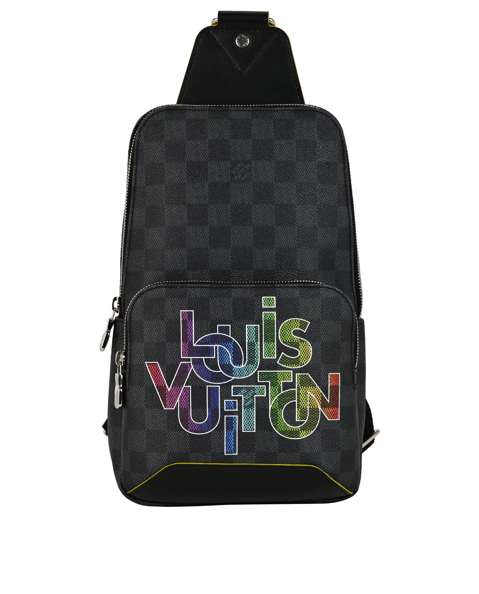 The Avenue Slingbag is made from Damier Graphite canvas with a Louis Vuitton Paris leather patch on the front outside pocket, adding a contemporary twist. The adjustable nylon strap can be attached to the D-ring on right or left side of the bag. It is more sustainable than earlier models, thanks to its canvas strap and lining.