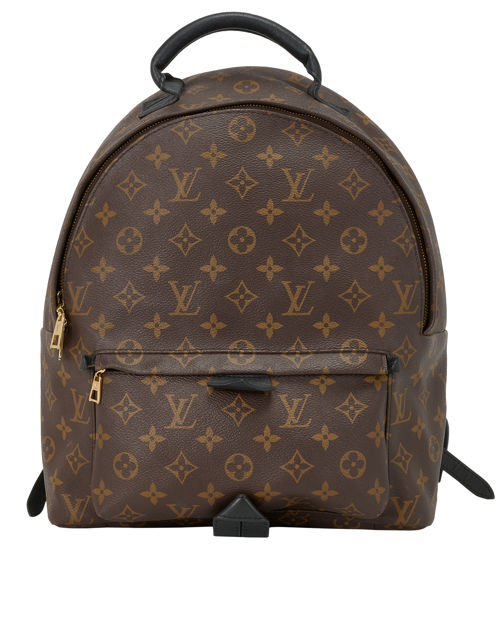 Crafted from monogram canvas with black leather trim, it features soft leather straps, gold-tone hardware, and a practical front zip pocket.