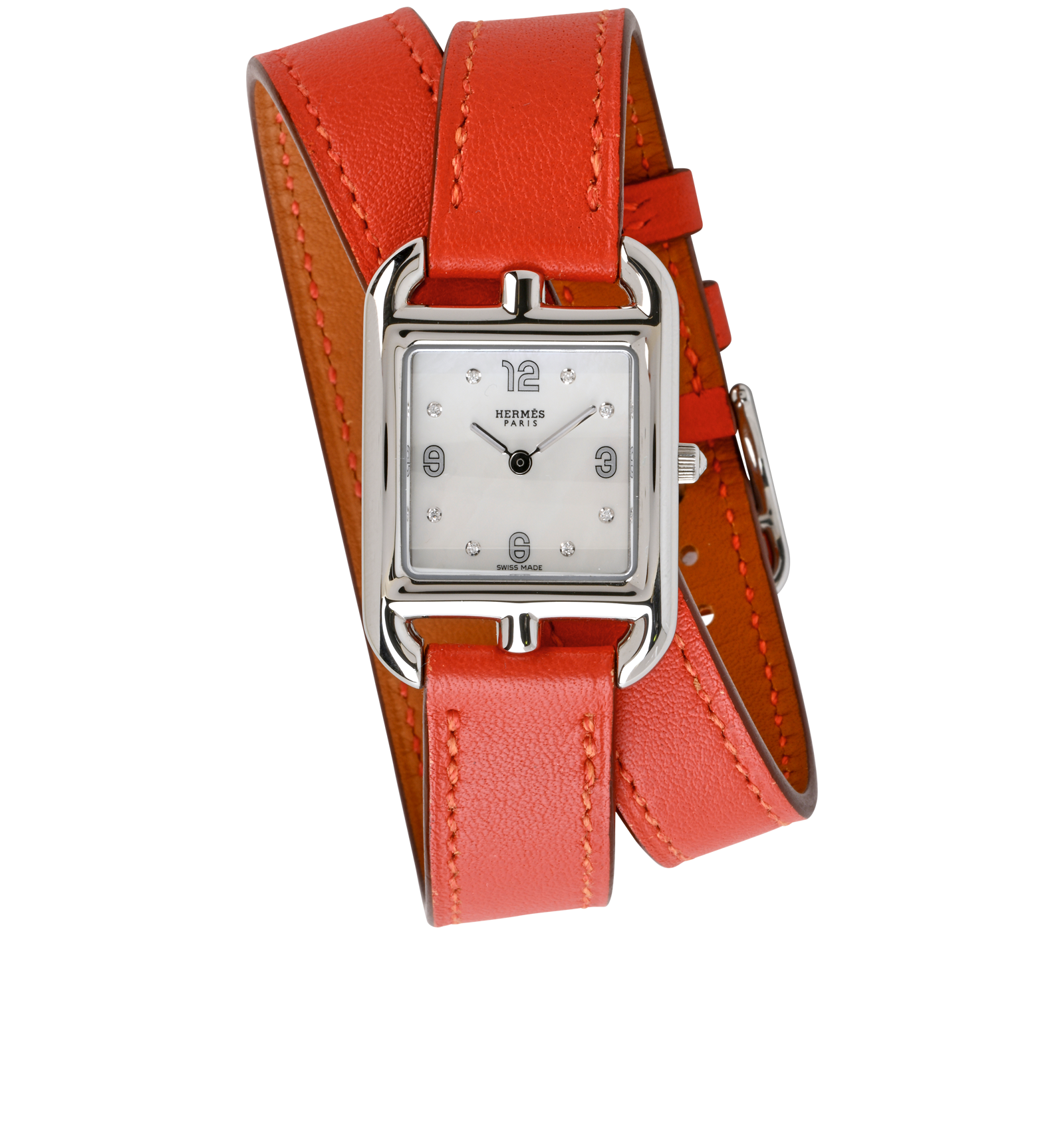 Steel watch, quartz movement, diamond-set white mother-of-pearl dial, long interchangeable strap in etoupe Swift calfskin. Made in Switzerland. Metallic finish: Steel. Large model, 37 mm Lug to lug height: 37 mm Case width: 29 mm Steel case. Anti-glare sapphire crystal. Diamond-set white mother-of-pearl dial, 8 diamond-set chatons (0.04 ct) Quartz movement, Swiss Made Hour, minute functions. Water-resistant to 3 bar. Avoid all contact with water while wearing your Hermès leather watch.Long single tour strap in etoupe Swift calfskin, steel pin buckle.