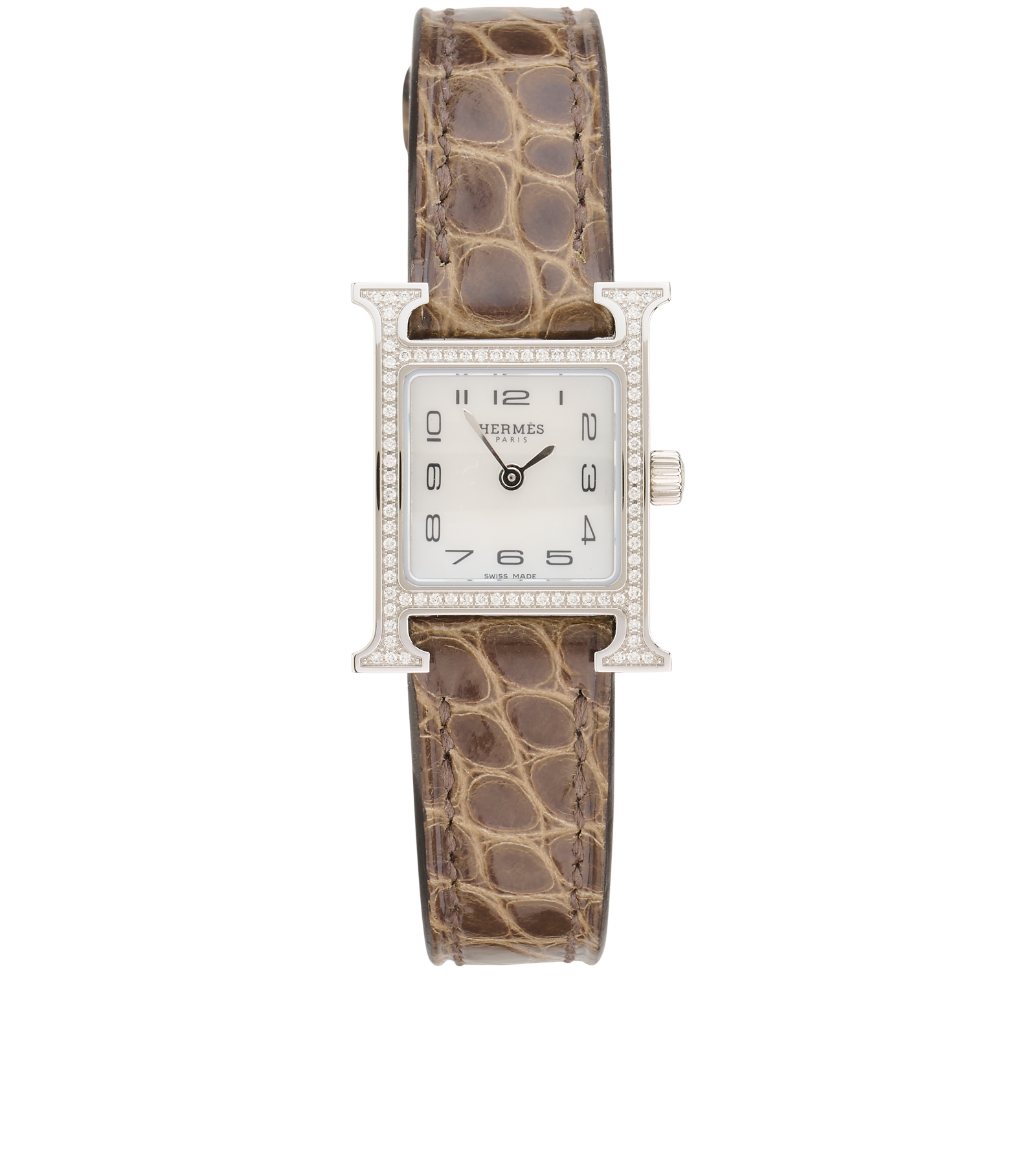 Hermes Mini Heure H Watch, £3,500, Jewellery, Brown, Alligator/Stainless Steel, Front view